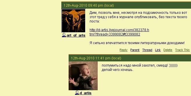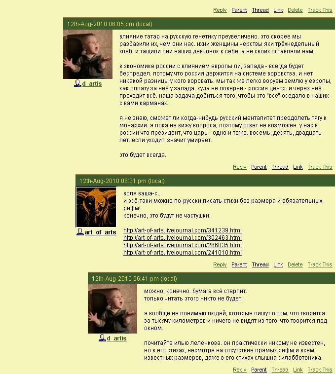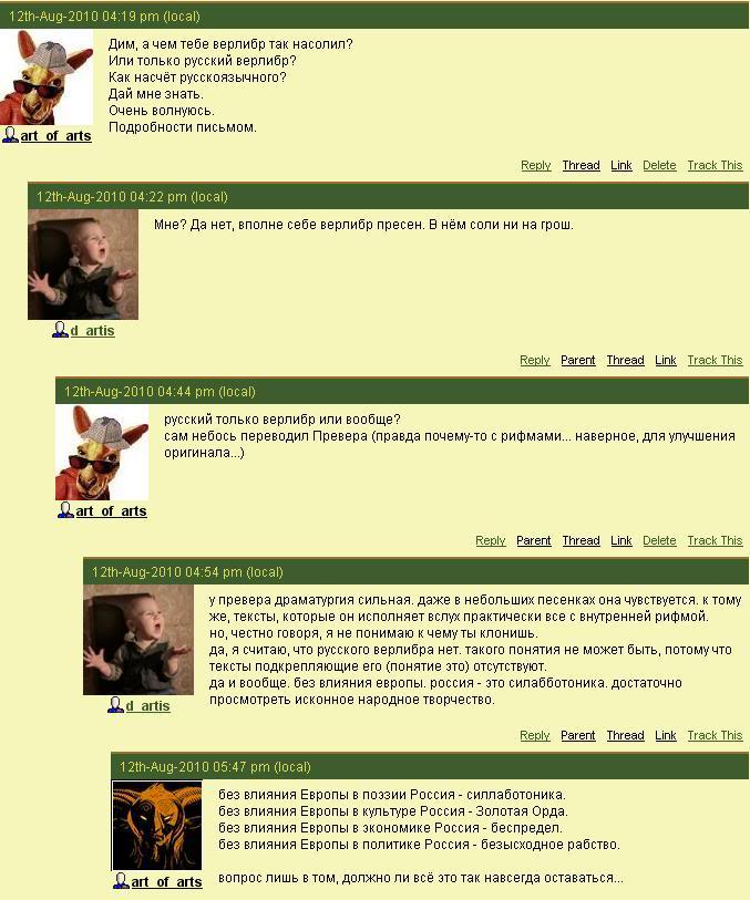 Время от времени случается вести поистине восхитительные обмены мнениями с российскими поэтами! Грех лишать читателей возможности познакомиться со взглядами этого среза русской интеллектуальн ой среды на поэзию, более того - на роль России в мире, на стоящие перед Россией экзистенциальн ые задачи и на правильное отношение к Западу. Ну и вообще - характерный в этих кругах шарм тоже достоин ознакомления с...