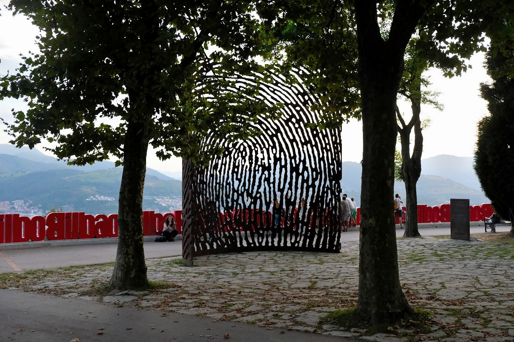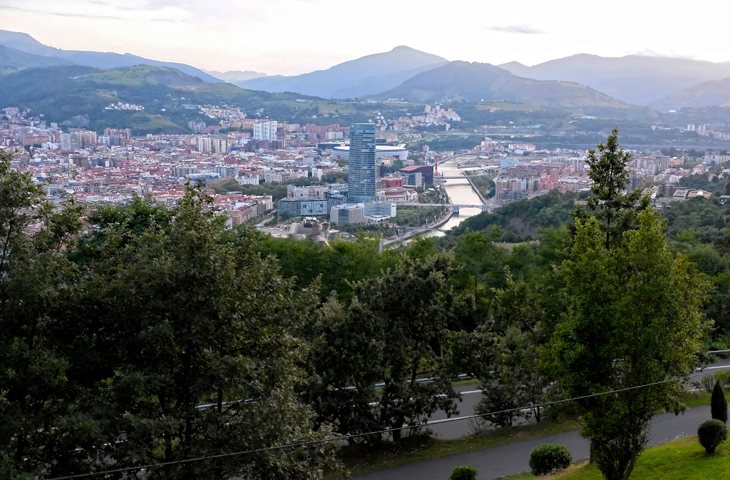 13. Долгое время наш автобус карабкается по серпантинам на самый верх нависающего над городом с северо-востока хребта, на вершине которого расположен Parque Centenario Artxanda. Вообще-то сюда можно добраться из города фуникулёром (вон он на картинке внизу, красный вагончик).