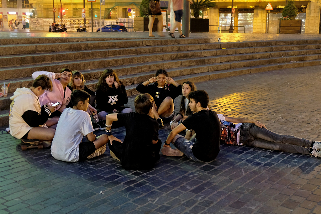 26. На площади, на брусчатой мостовой расположилась группка молодёжи. Свободные, общительные, весёлые без капли алкоголя, no drugs, ни у кого в руках нет сигареты...