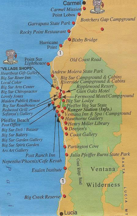 Big Sur расположен примерно на трети пути между Сан-Франциско и Лос-Анджелесом. Название произошло от испанского 'pais grande del sur' – Большая Южная Страна – так испанские монахи, добравшиеся до Сан-Францисского залива, называли огромную малопроходимую и потому неисследованну ю дикую местность, лежавшую к югу от Монтерея. Сегодня это название отрезка грубо вырубленного Природой калифорнийског о побережья, длиной около 90 миль, между Кармелом на севере и Сан-Симеоном на юге. О Сан-Симеоне и о расположенном там знаменитом замке Херста я, может быть, расскажу в другой раз. С севера на юг вдоль береговой линии вьётся Первый хайвэй; слева подымаются хребты Санта-Люсии, справа от шоссе – обрыв к океану.