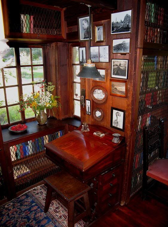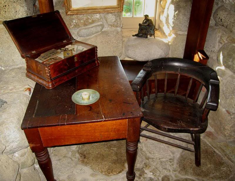 Робин обычно работал на втором этаже дома, в своём кабинете. Здесь он написал большую часть своих стихов. Вот его стол, кресло и ящик с очками, записными книжками, прокуренными трубками и прочими необходимыми поэтам вещами: