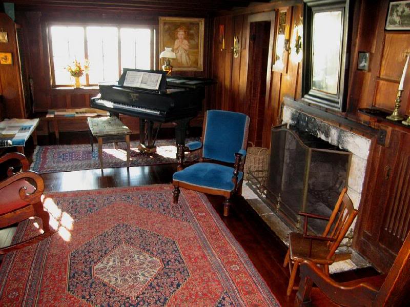 Ниже – гостиная, с роялем, на котором играла Уна. Правда, среди гостей дома бывали Чарли Чаплин и Джордж Гершвин, так что не только пальцы жены поэта касались этих клавиш, и я с наслаждением, медленно провёл рукой по клавиатуре.