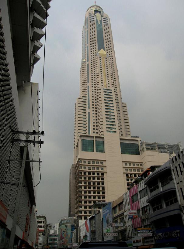 Так выглядит сам Baiyoke Suitе Hotel с уровня тротуара. Небо тёмное перед коротким, но мощным тропическим ливнем: