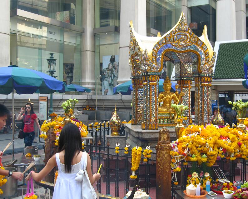 На людном перекрёстке улиц в самом центре Бангкока расположена одна из молитвенных святынь таиландской столицы - Erawan Shrine.