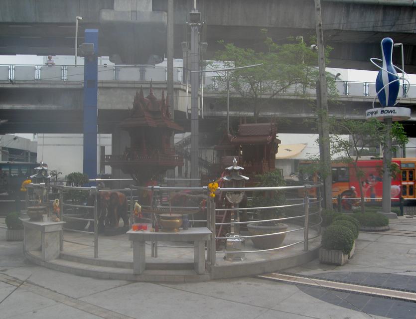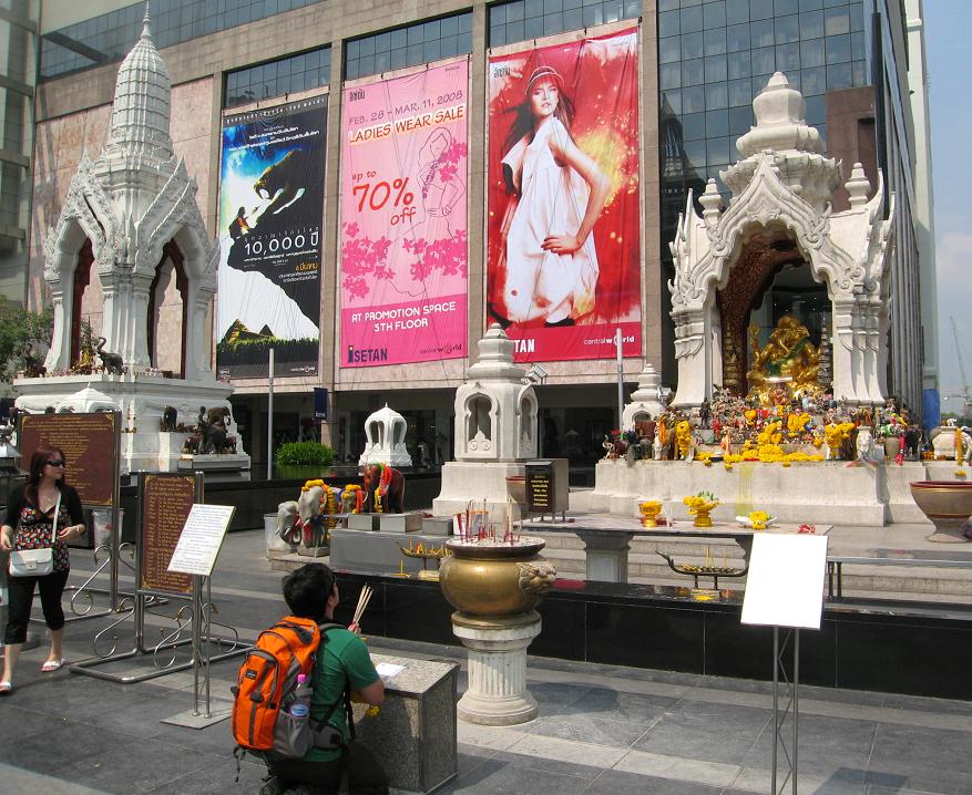 В конце 1955 года профсоюз служащих таиландских отелей и компания Туризм Лимитед были извещены адмиралом Луангом Сувичанфаетом, который специализирует ся в области астрологии, о том, что первоначально выбранное место для закладки гостиницы Erawan Hotel, не соответствовал о правильному расположению звёздных тел. Это недоразумение должно быть скорректирован о путём строительства святильни в честь Thao Maha Brahma и Дома Духов на территории, купленной для возведения отеля. Тогда и были по совету Адмирала построены молельня Erawan Shrine, посвящённая Thao Maha Brahma, и Дом Духов. Образ Брамы выполнен в виде алебастровой скульптуры, покрытой золотым листом, в соответствии с проектом скульптора, мистера Шита Фимковита [примечание Кальмейера: мне так и не удалось выяснить националность скульптора Фимковита или Фимковича или как там его ещё...]Мы пришли сюда в один из многочисленных буддийских праздников - посмотреть, как люди празднуют. Считается, что искренняя молитва у Erawan Shrine гарантирует выполнение всех тайных желаний влюблённых, а также успех при сдаче экзаменов и выигрыш в лотерею. Вы тоже можете присоединиться к молящимся, купив на небольшую сумму ароматических палочек, жертвенных свечей, цветочных ожерелий (желательно жёлтого цвета) и произнести короткую молитву о ниспослании выполнения вашего желания. Поскольку мне недоступны радости, связанные с молитвами, я просто смотрел и фотографировал