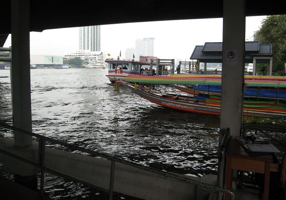 Но в Бангкоке интересно путешествовать не только по улицам. Через центр города протекает довольно приличного размера река, называемая Чао-Прайа - Река Королей, и мы решили совершить поездку по реке, чтобы поглядеть на город с борта speed-boat. Speed-boats - раскрашенные в цвета радуги остроносые узкие лодки, крытые тентом, с мощными моторами - совершают регулярные рейсы с интервалами минут 10 вниз и вверх по реке, и я рекомендую всем посещающим Бангкок воспользоватьс