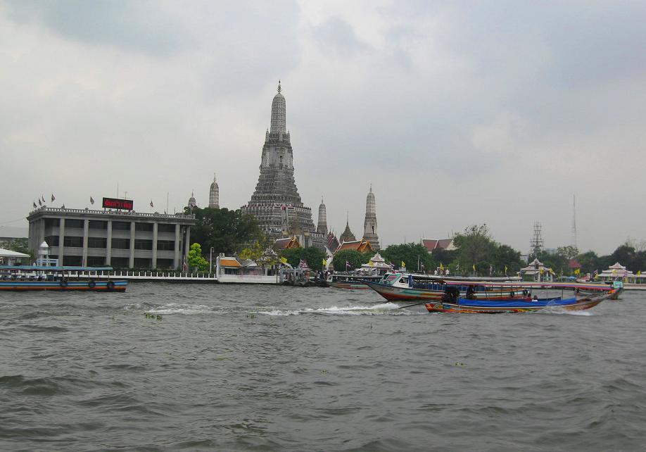 По берегам Чао-Прайа расположены восхитительной красоты буддийские храмы. Вот один из них, называемый Wat Arun -Храм Восхода, на западном берегу реки: