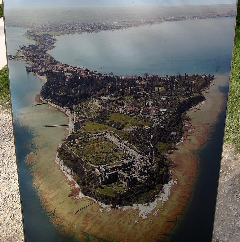 Если идти ещё дальше на север, прийдёшь к старинным развалинам Гротов Катулла, как видно на снятом с воздуха фото косы, выставленном муниципалитето м для посетителей:
