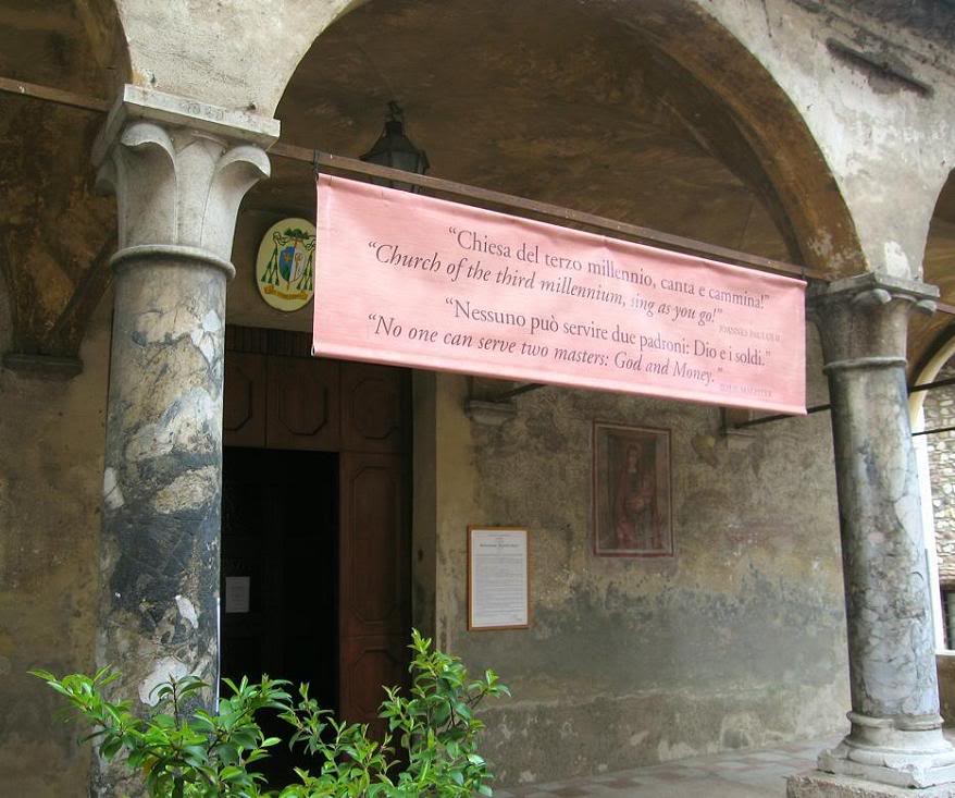На мой взгляд, второй лозунг явно бьёт мимо цели, поскольку вряд ли туристский городок мог бы выжить одними молитвами. Судя по количеству кафе, ресторанов и лавок, горожане принимают церковные советы with a grain of salt.