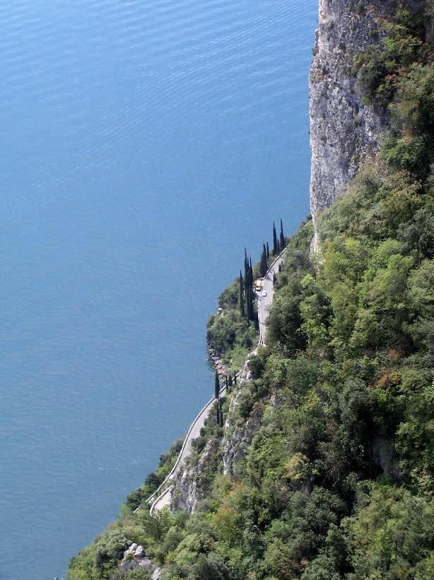 А это взгляд вниз на серпантин с базальтового обрыва вблизи городка Тремосине на северо-западной стороне озера: