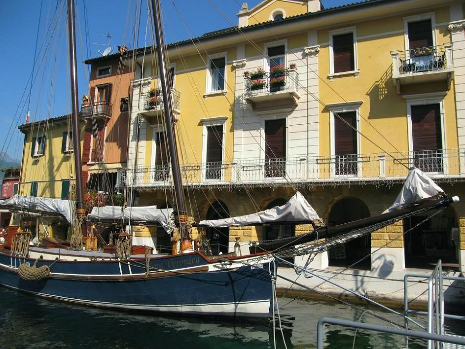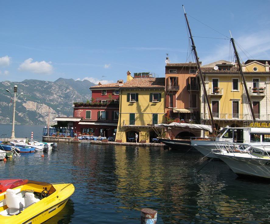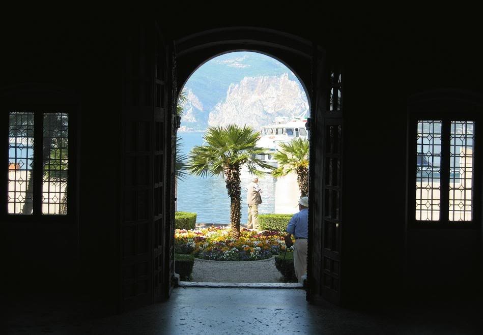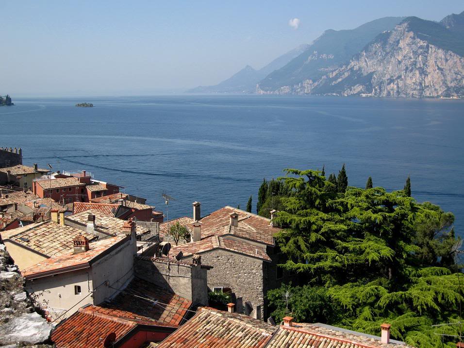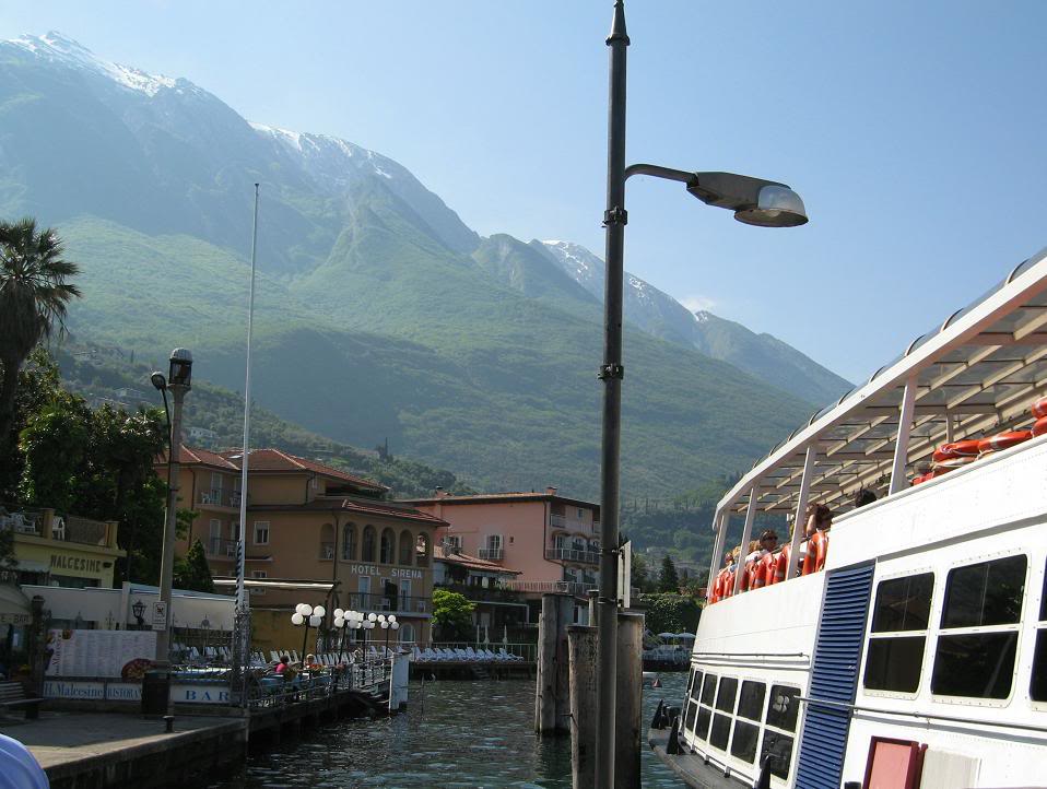 Расположенный на склонах горы Бальдо, Мальцесине утопает в пышной зелени олив, кипарисов и олеандров. Здесь и там видны виноградные лозы. Над синими водами озера, на скале, расположенной перпендикулярн о к берегу озера, высится замок Скалигьери, сооружение 13-го века. Из городка на вершину горы Бальдо идёт подвесная дорога, подымающая туриста на 1800 метров – из средиземноморс кого климата в снежные Альпы. Если кто из читателей решит провести отпуск на озере Гарда, я советовал бы отвести на это «дело» неделю, зарезервировав отель в Мальцесине. Мы с Тоней влюбились в этот городок...