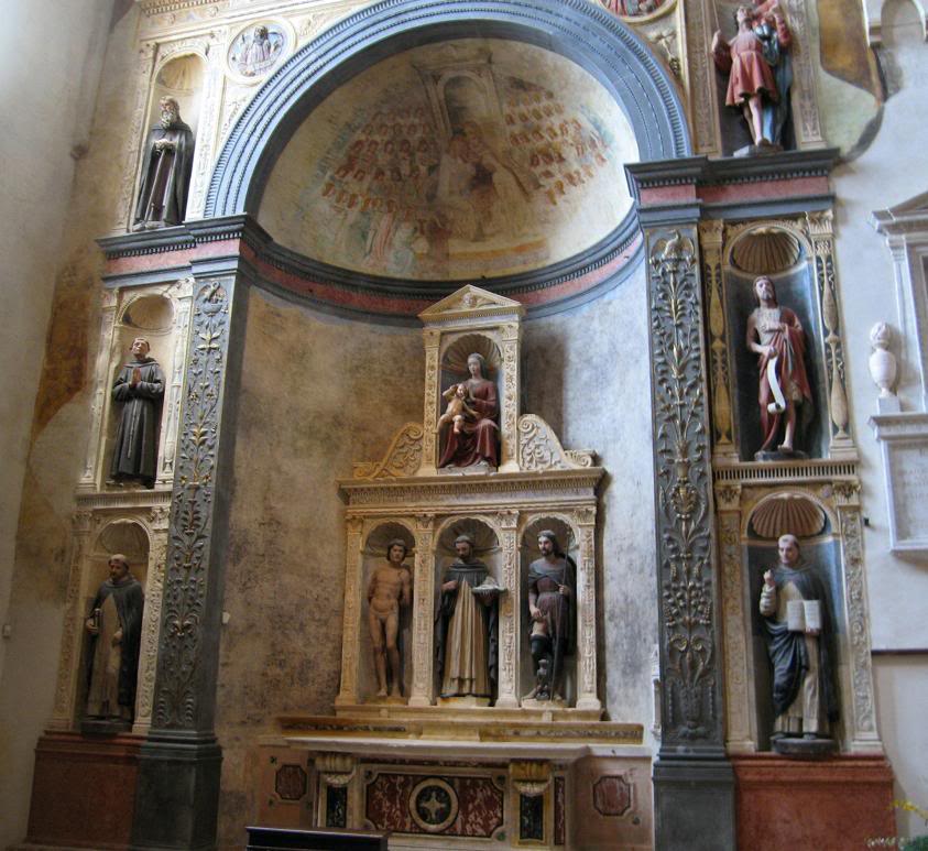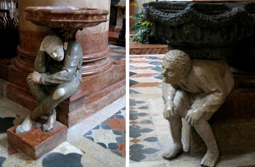 Среди скульптур, стоявших в Базилике, мне больше всего понравились две фигуры веронцев, державших на плечах огромные мраморные жертвенные тарелки. Пользоваться вспышкой там не позволяют, поэтому снимки вышли не слишком резкими. Не взыщите.