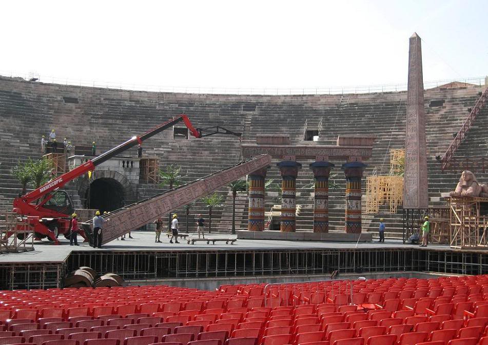 ... и поднялся наверх, глянуть на то, как выглядит сегодня старинный амфитеатр. В середине арены был построен помост, с которого рабочие убирали декорации какого-то, повидимому, египетского зрелищного мероприятия. Было противно смотреть на фуфло декораций, и я, оценив внушительные размеры амфитеатра, поторопился убраться наружу.