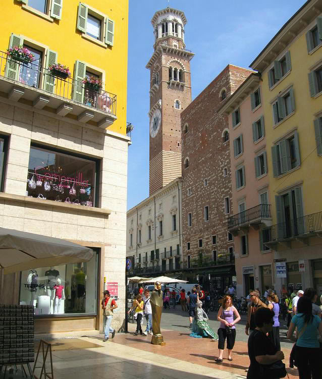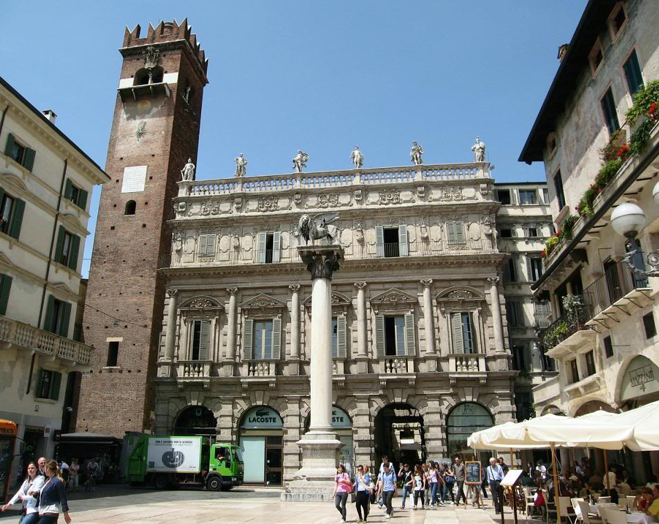 Palazzo Maffei с примыкающей к нему башней Гарделло. Перед дворцом – колонна с крылатым Львом Святого Марка.
