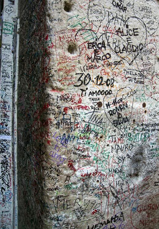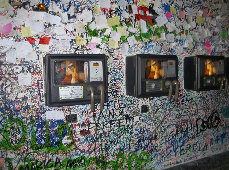 В ход идут не только маркеры; стены усеяны налепленными бумажками с мольбами о любви, здесь же висят автоматы, позволяющие жаждущим за пару euro насладиться короткометражн