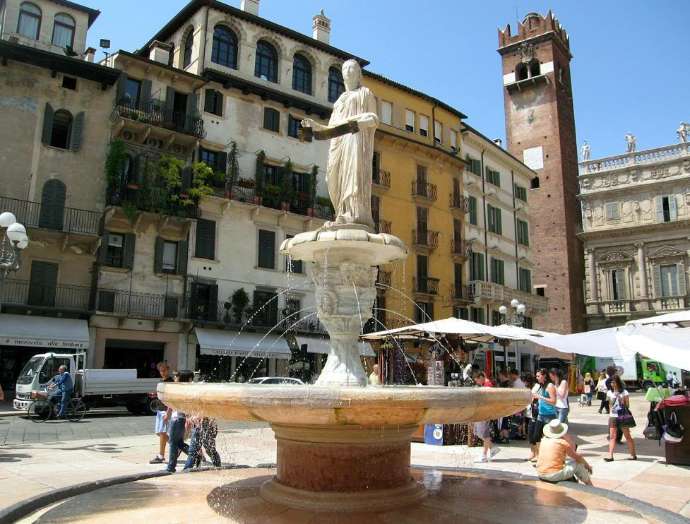 В центре площади стоит знаменитый фонтан со статуей Пресвятой Девы Марии Веронской