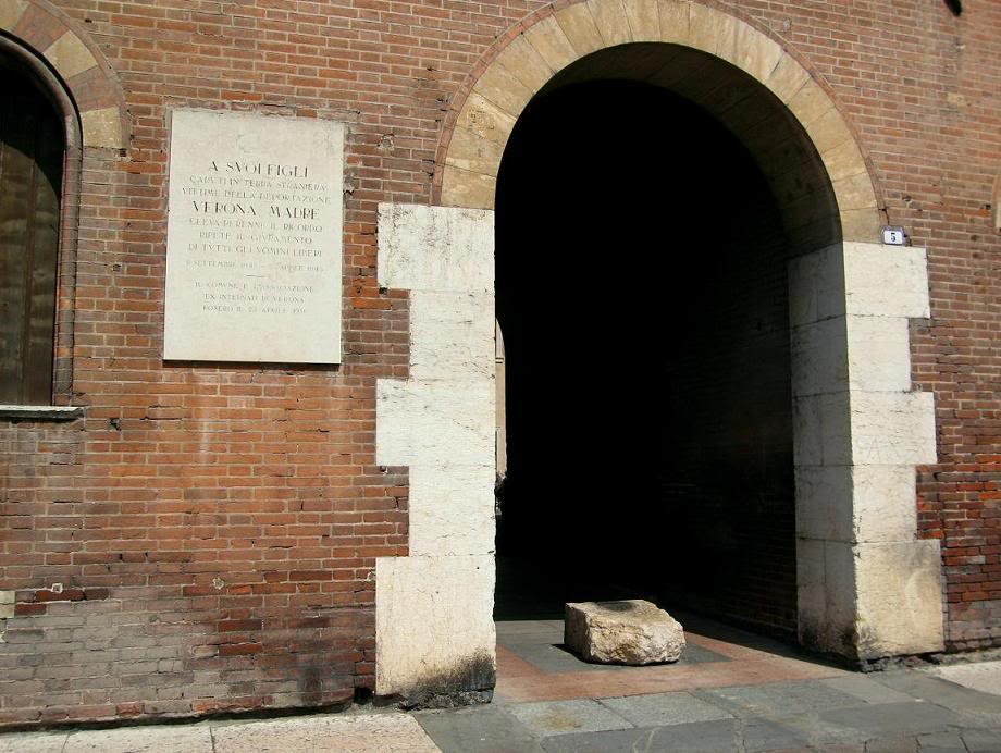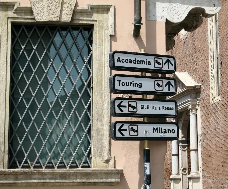 Самый смешной кадр, связанный с бедной шекспировской парой, я разыскал не во дворе дома Капулетти, а на углу улицы, неподалеку от «святилища». Это был дорожный знак, указывающий распалённым страстями туристам, где поблизости можно найти постель, чтобы повторить любовный подвиг: нужно просто двигаться по стрелке к кровати "Giuliette e Romeo"! Это и есть коммерческий гений веронцев. Надо полагать, яд и кинжал входят в стоимость номера...