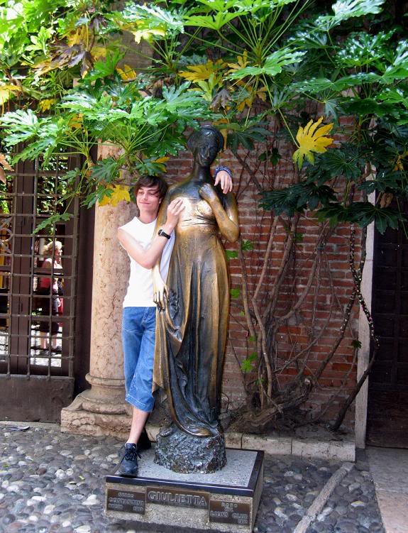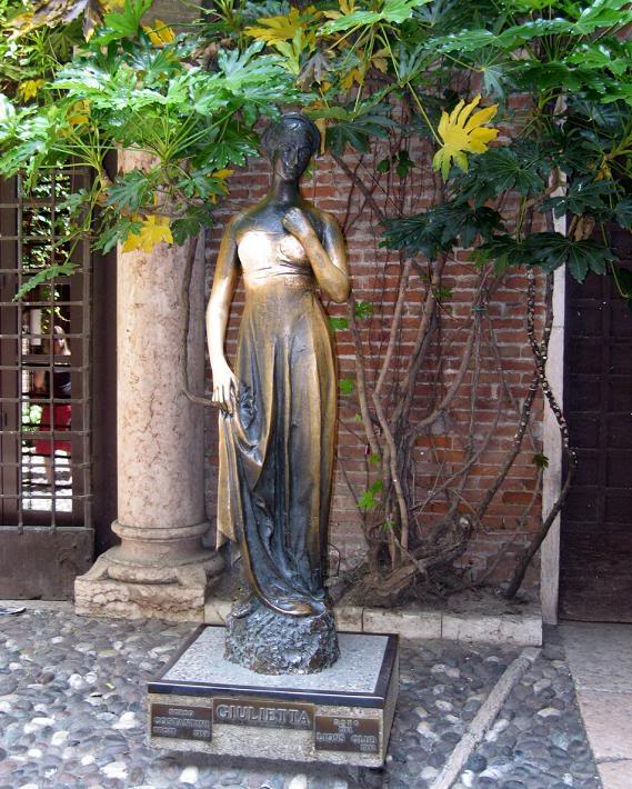 Во дворе, под «Балконом Джульеты» ажиотаж толпы достигает максимума. Здесь стоит бронзовая статуя Джульеты с отполированной до блеска правой грудью