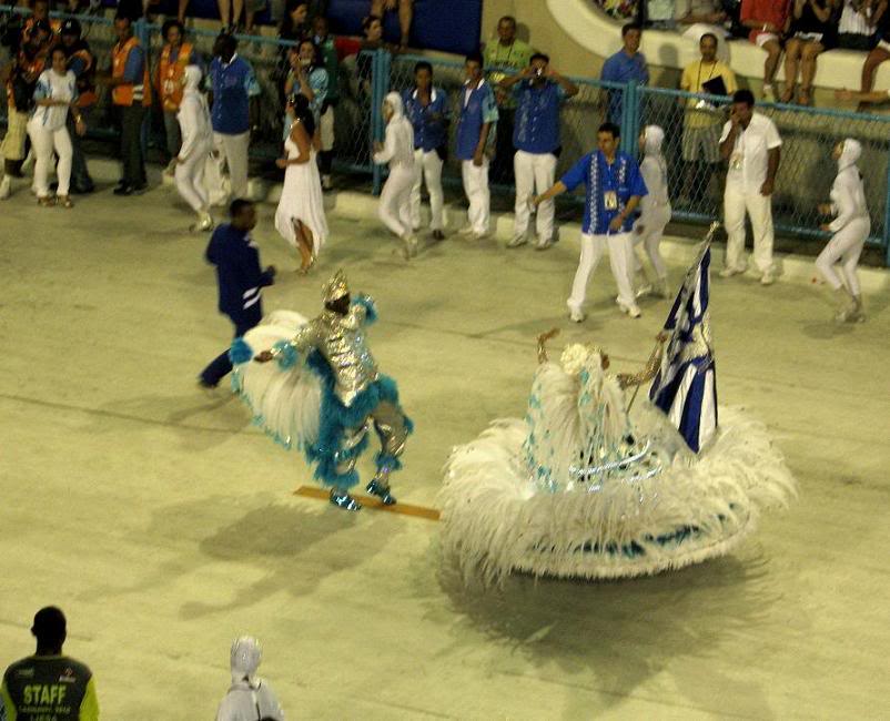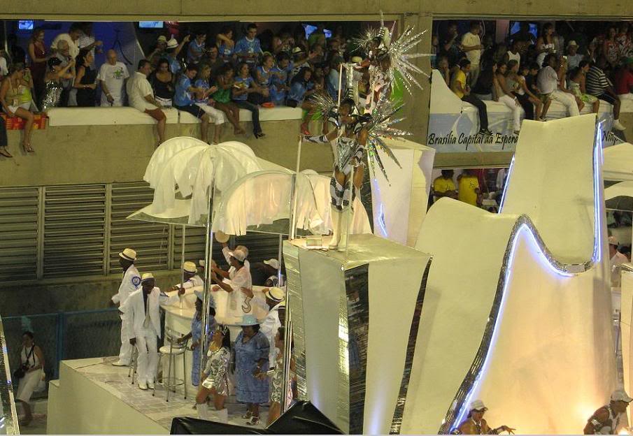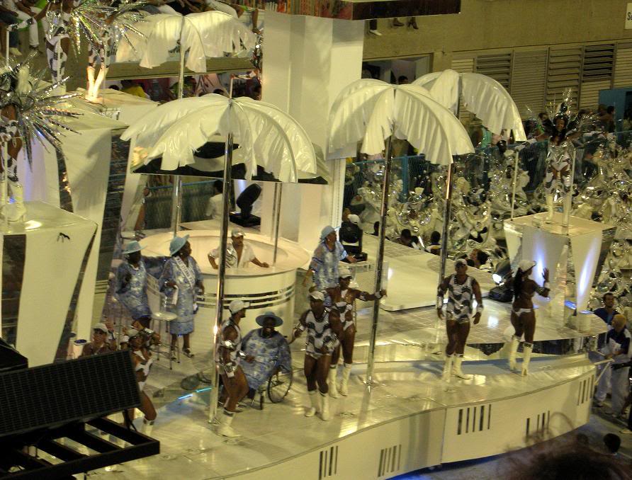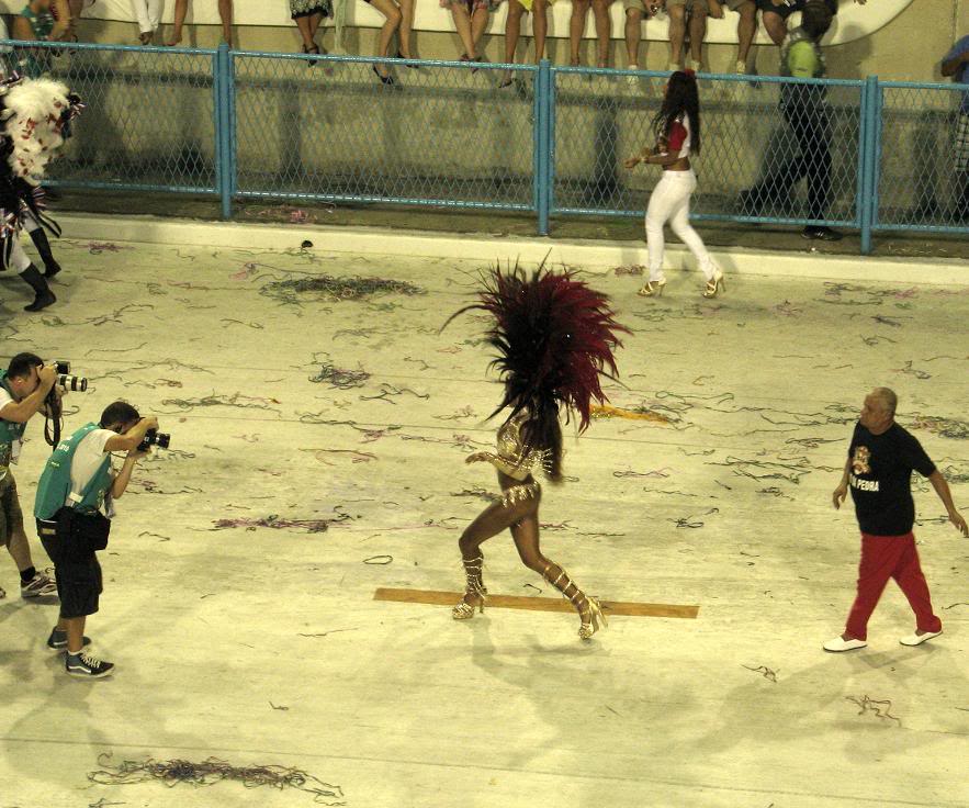 Десятки чёрных парней в белых, зелёных, красных комбинезонах толкают платформы, без устали пританцовывая ту же самбу. Затем следуют танцовщики школ самбы: на бетон Самбодрома волна за волной выплывают (вытанцовывают) участники в фантастических костюмах.