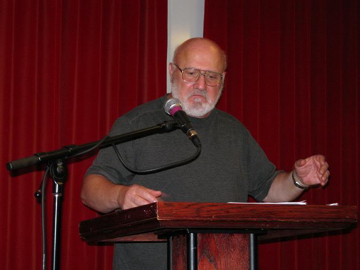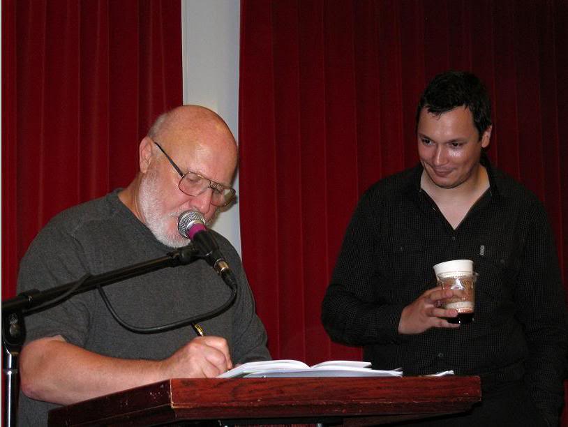 Я притащил с собой на вечер свой camcorder, дабы запечатлеть для читателей незабываемую картину явления Кальмейера народу, даже распаковал и поставил камеру на треногу, но... потом забыл её включить перед чтением, так что отчитаться мне перед вами нечем. К счастью, среди публики была прекраснейшая поэтесса Сан-Франциско и его окрестностей, Машенька С.