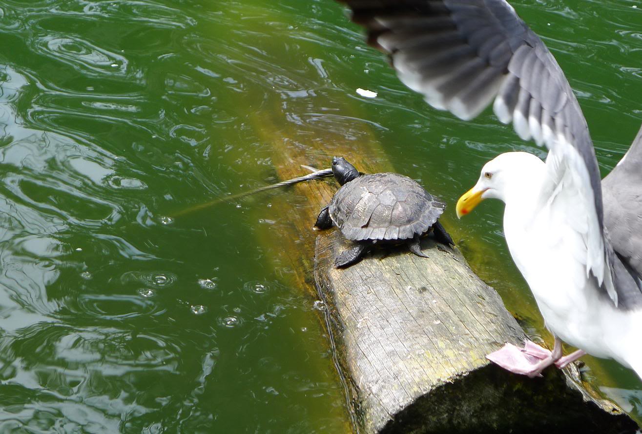 я всякая озёрная живность: из глубины всплывают черепахи и огромные карпы, в то время как сверху пикируют чайки