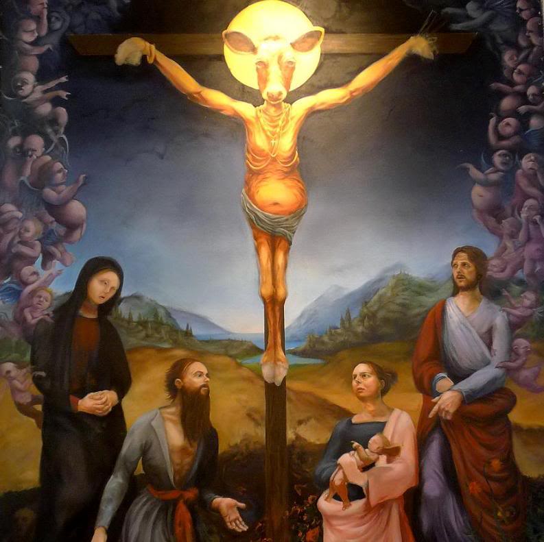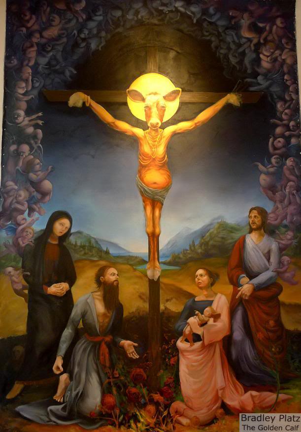 "Bradley Platz, The Golden Calf (Золотой Телец) - Oil and Acrilic on Canvas - In Progress...". In Progress, должно быть, означало, что работа над этой картиной ещё не закончена, и следовательно, в будущем она может стать ещё лучше: