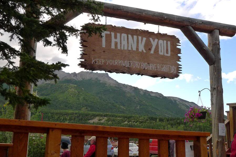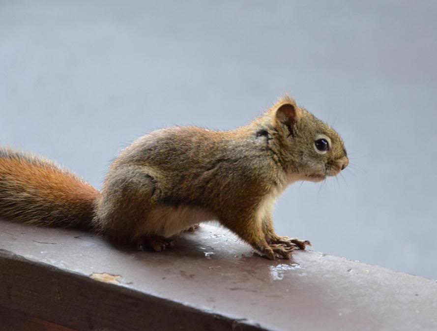 К тому же нас пришёл поздравить с прибытием в Denali бельчонок, совсем ничего не боящийся, напротив, явно и нагло выпрашивавший чего-нибудь съестного. Но вокруг висели плакатики с требованием не кормить "wild life", так что бельчонок удалился, не солоно хлебавши.