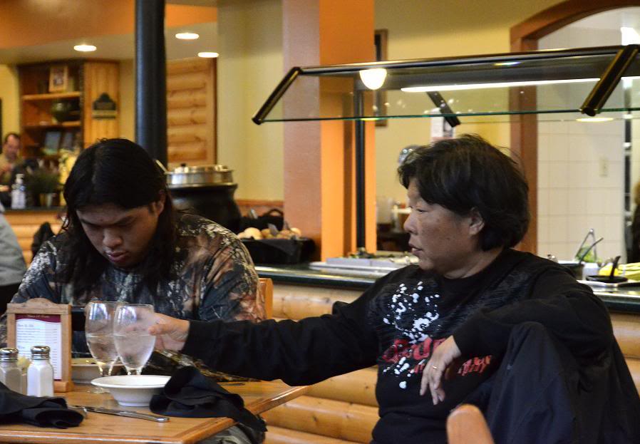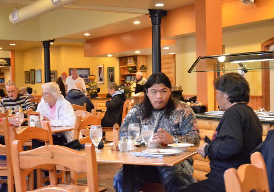 Вечером мы сделали стратегическую ошибку, отправившись обедать в кафешку нашего курорта. Еда была безвкусной, выбор вин паршивым, цены... ну ладно, что уж о ценах на вино говорить в этой глуши... Зато сидевшая рядом с нами семья эскимосов пожирала всё в необычайных количествах и с аппетитом. Я стал их фотографироват