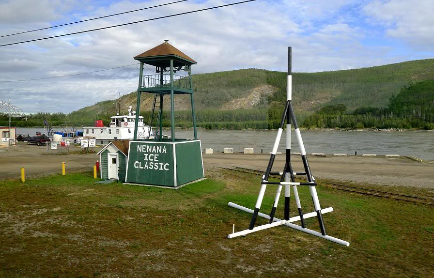 И треножник, и башня с часами - атрибуты одного из популярных на Аляске развлечений, начало которому было положено в 1917 году. Той зимой рабочие-строители железной дороги собрались в посёлке в ожидании момента, когда река освободится от льда, чтобы баржи могли доставить необходимые для строительства материалы и припасы. От нечего делать они стали заключать пари о том, когда именно вскроется река. Было решено поставить на лёд ярко раскрашенную треногу, и следить, в какой момент она пересечёт траверс показанной на фото башни. Ставки принимались с точностью до минуты. К пирамиде был привязан трос, останавливающи