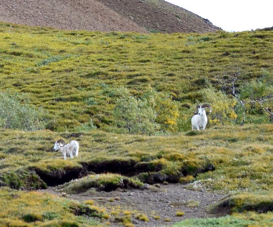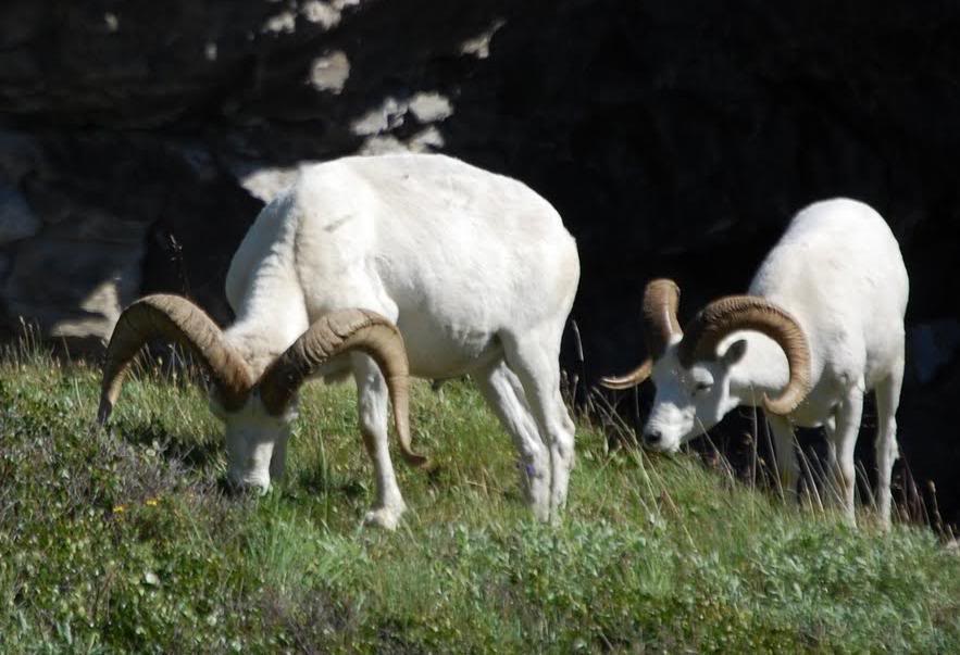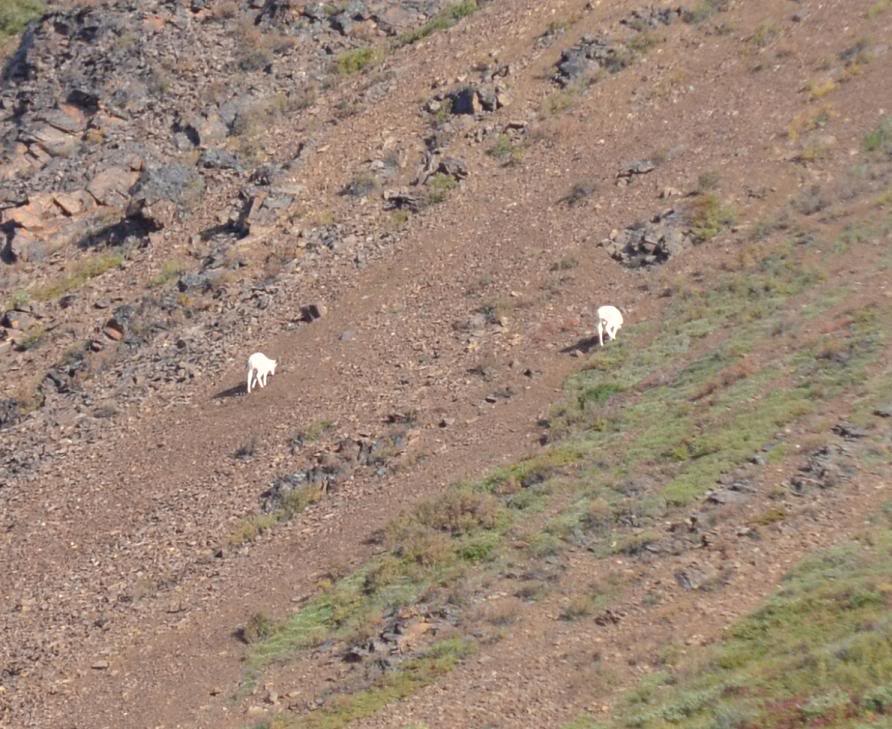 Сперва Dall Sheep. Эти круторогие белые козлы проводят лето высоко на скалах, осыпях и обрывах гор, подальше от обитающих в низинах хищников, и только на зиму спускаются в долину (в это время года их белый камуфляж оказывается очень кстати).