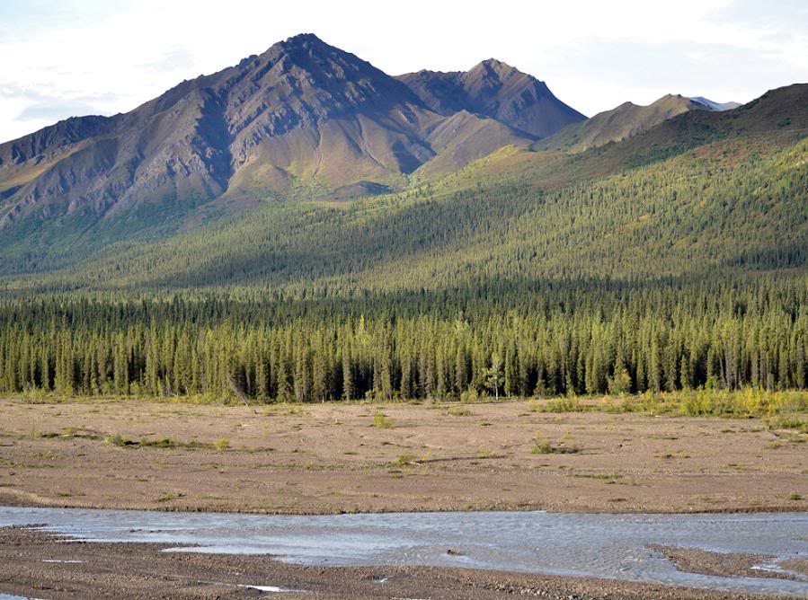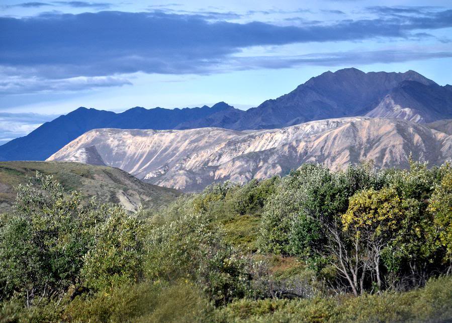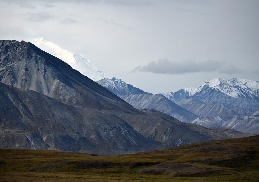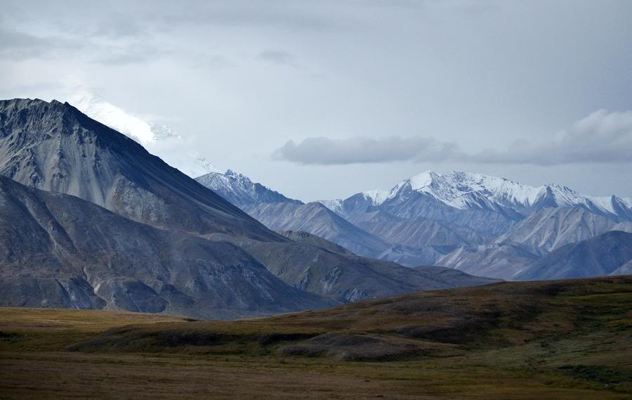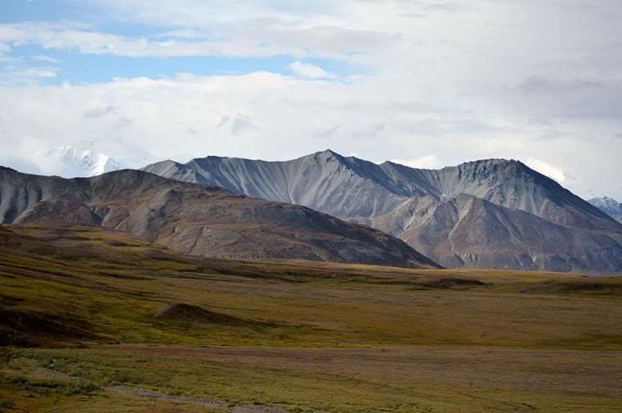 Постепенно горы к югу от дороги становились всё выше. Автобус полз вверх по плато, идущему параллельно гряде заснеженных вершин Alaska Range.