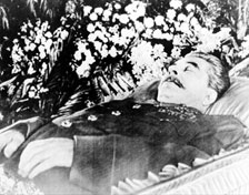 Да, вот ещё что: в один день с Отцом Народов и Лучшим Другом Доярок умер великий русский композитор Сергей Прокофьев. О его смерти было запрещено объявлять в газетах до окончания церемоний, посвящённых похоранам тирана. Все цветы в Москве были отправлены на украшение сталинского лёжища, и друзьям Прокофьева пришлось украсить гроб композитора цветами из домашних цветочных горшков, да и сами похороны были также отложены до 10 марта. Тело Прокофьева лежало в его тесной квартирке, в двух кварталах от Дома Союзов, где был выставлен напоказ труп диктатора. В квартире царило молчание – люди боялись сказать что-нибудь лишнее. В конце концов, в полной тишине, Давид Ойстрах достал скрипку и заиграл адажио из скрипичной сонаты Сергея Прокофьева...