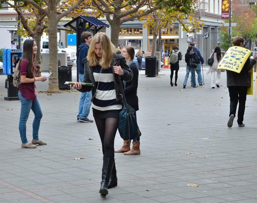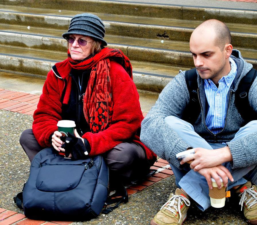 Возле самого выхода с территории кампуса одиноко стоял столик университетско го Демократическо го союза. Возле столика никто не останавливался, и я решил внести хоть какое-то оживление в лица сидевших в ожидании внимания парня и девушки. "Привет демократам!" - крикнул я издалека, направил на них объектив камеры, и был немедленно вознаграждён знаком "peace" и радостными улыбками.