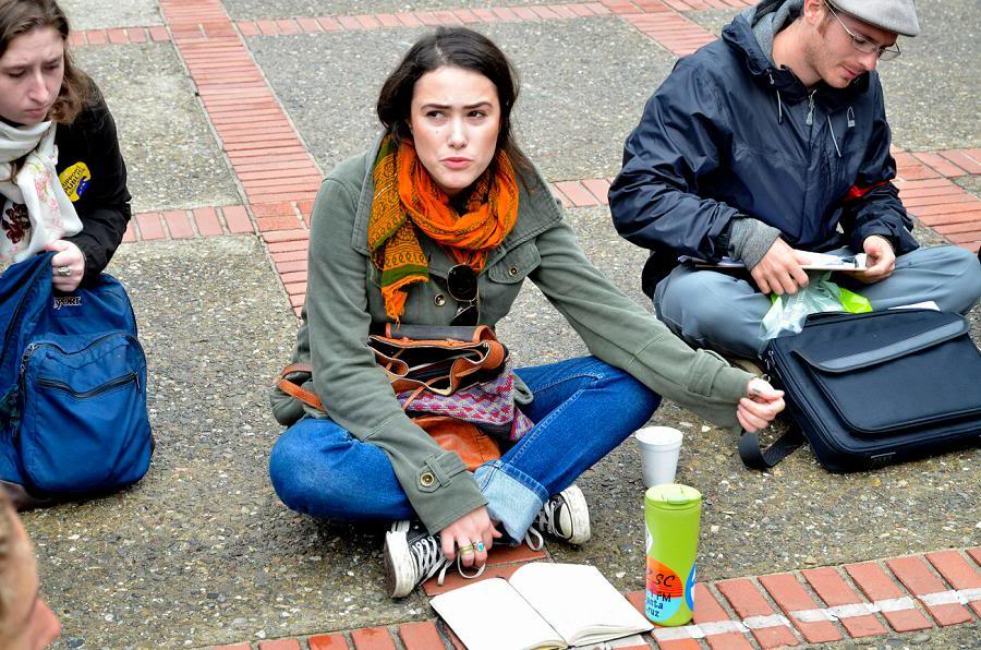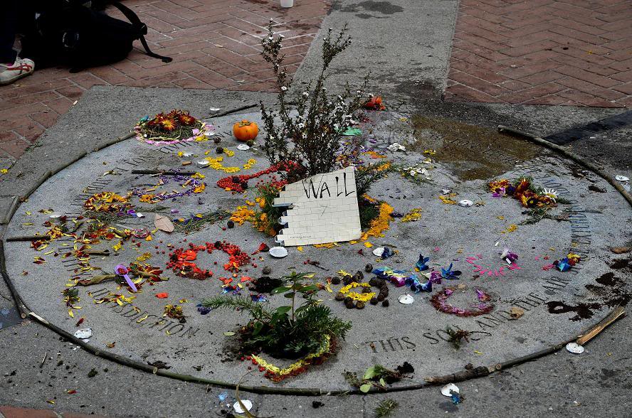 Чуток подальше, в середине площади перед Sprout Hall была устроена трогательная композиция, долженствовавш ая символизироват ь "Стену": вырванный из студенческой тетрадки листик с надписью "Wall" намекал на связь со всенародным движением Occupy Wall Street.