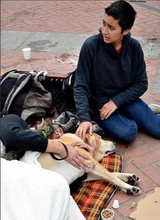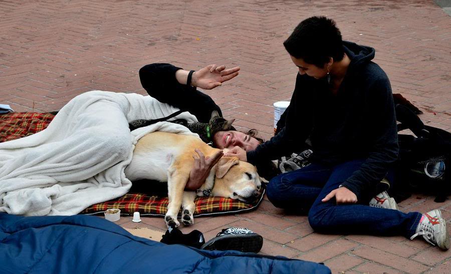 Следующий экспонат был центром экспозиции протеста. Лыка не вяжущий бородатый парень возлежал на брошенной на тротуар тряпке. Скульптурную группу дополняли старый пёс, кот, которого парень постоянно тискал, и стриженная под джульбарса, очень симпатичная девчушка, на которую парень не обращал никакого внимания, хотя она всё время поглаживала то пса, то его самого, не отводя влюблённых глаз от своего героя-оккупанта.