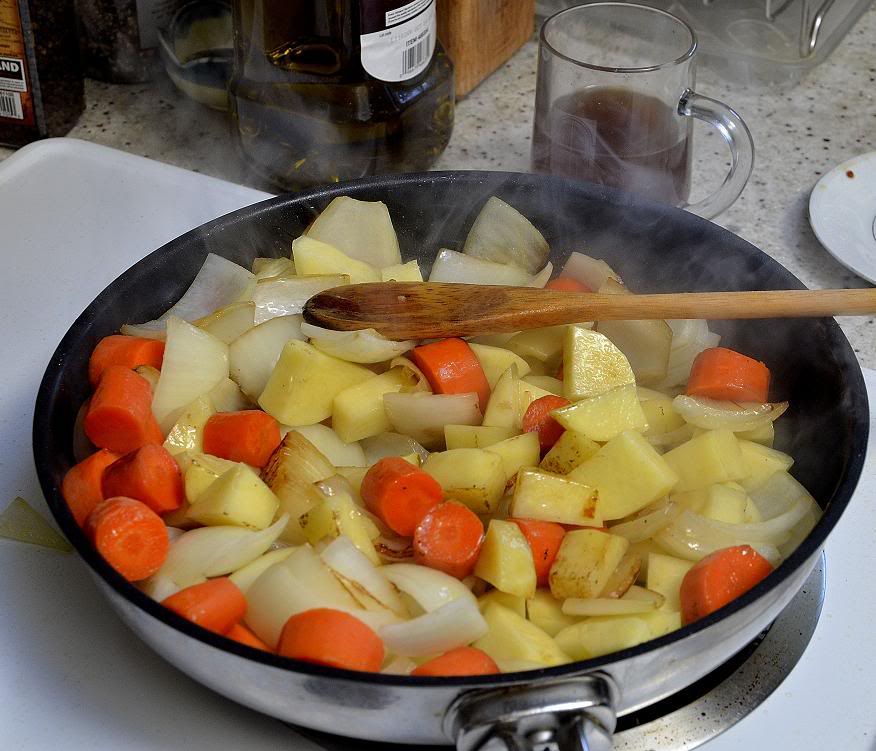 сь второй столовой ложкой оливкового масла, прожарьте на сковороде (на большом огне) лук и морковь в течение двух минут, потом добавьте туда же кубики картофеля и жарьте, тщательно перемешивая, ещё 3 минуты.