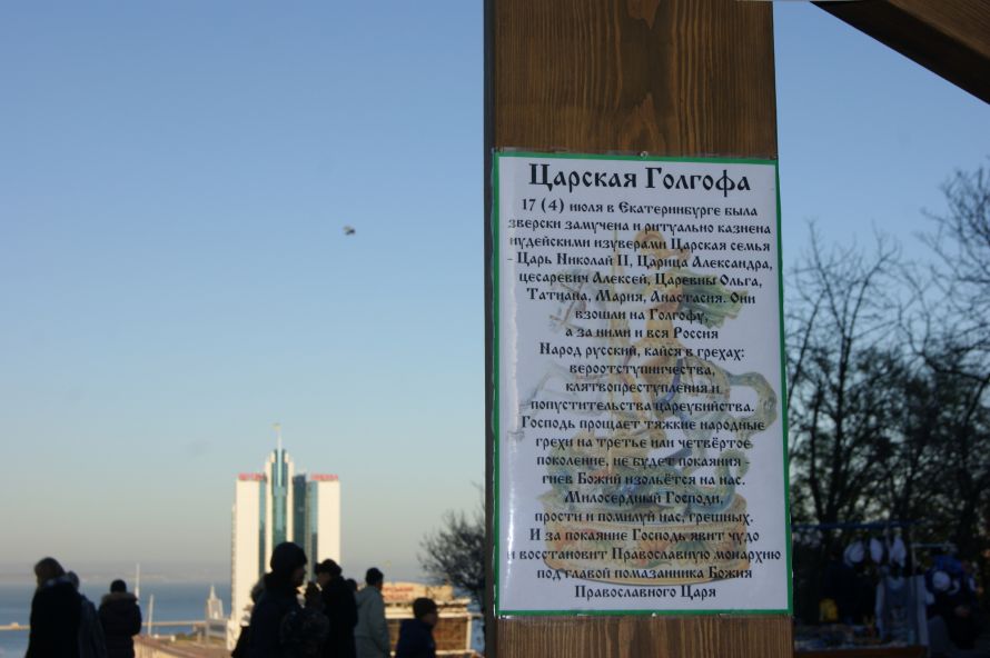 «Люди добрые! Со вчерашнего дня, 29 ноября, в Одессе на Приморском бульваре, возле Дюка, стоит огромный крест с царскими портретами, надпись на котором в частности, гласит, что царская семья «была зверски замучена и ритуально убита иудейскими изуверами». Цитата дословная. Конструкция такой величины в таком месте, стоящая вторые сутки могла быть установлена только с разрешения городской власти. Считаю правильным говорить, прежде всего, не о том, кто поставил, а о том, кто разрешил. Прошу максимально распространить информацию. Было бы хорошо, чтоб информация об этом стала известна в том числе и в Израиле».