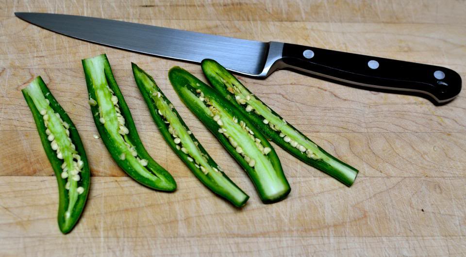 Разрежьте каждый из перцев халапеньо на две или три продольные части.