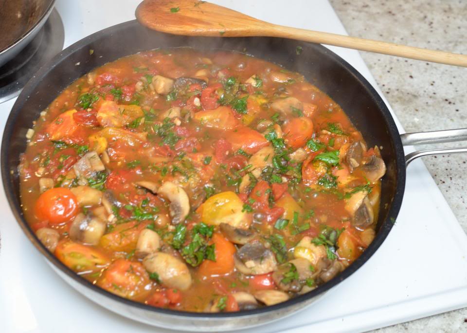Высыпьте в сковороду помидоры и тушите всё в течение пяти минут, тщательно перемешивая.