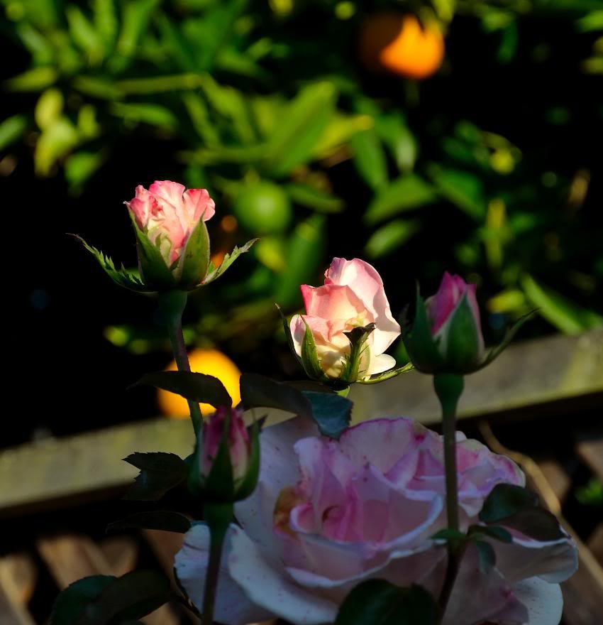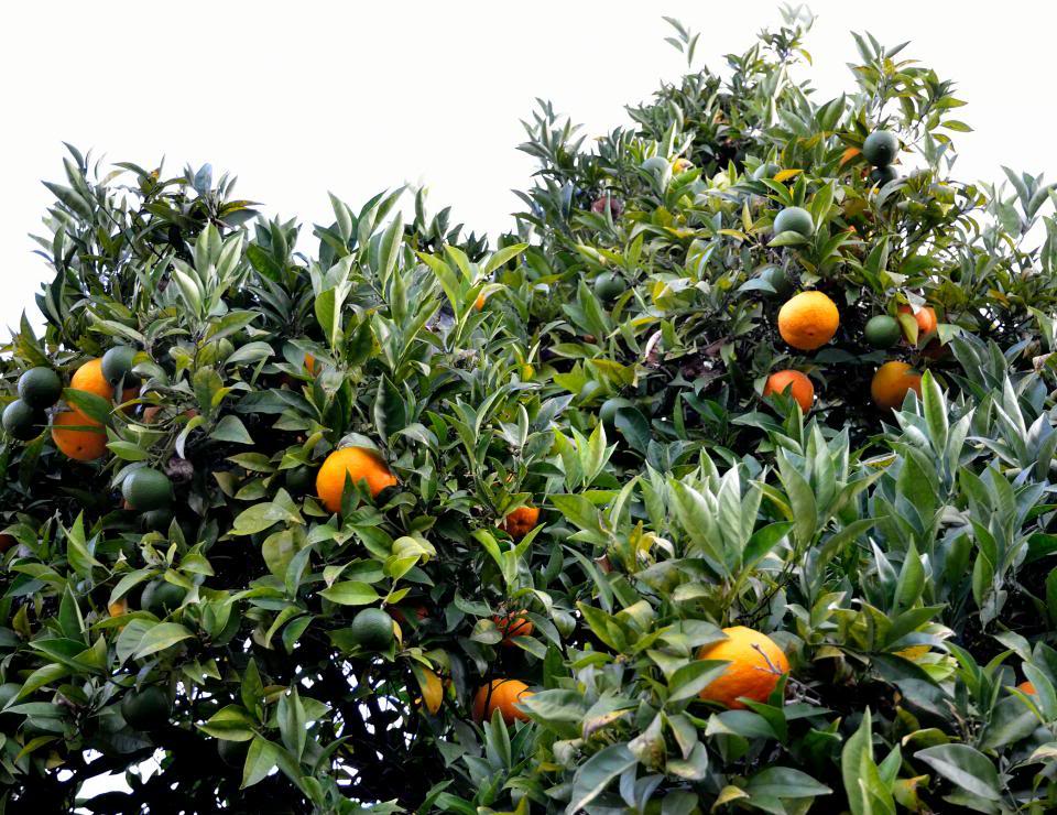 На апельсиновом дереве плоды прошлого года соседствуют с молодыми, зелёными.