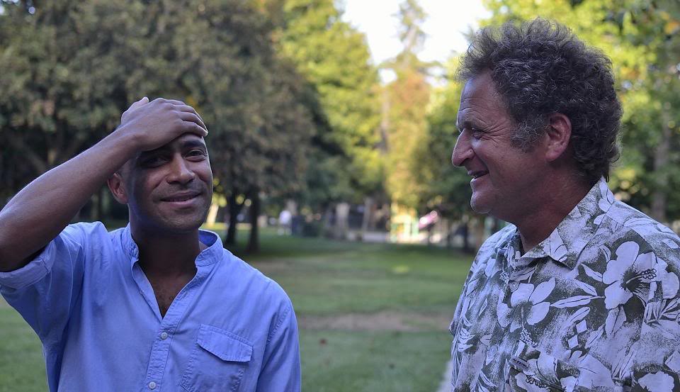 Энди, Тайсон и я в саду веселим друг друга идишскими анекдотами о религиозных евреях (трое взрослых мужчин "освобождаются от обетов" ;))). Меня не видно, я по обыкновению прячусь за видоискателем. К сожалению, как всегда, к утру все анекдоты благополучно улетучиваются из моей старой головы...
