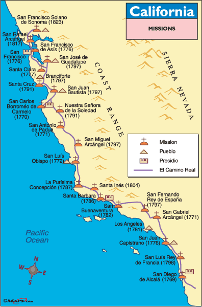 С юга на север Калифорнии ведёт El Camino Real – Королевская Дорога. Когда-то этой дорогой в Калифорнию пришли из Мексики первые поселенцы, не являвшиеся индейцами, – католические монахи, во главе со знаменитым Отцом Junipero Serra. Они выполняли «божью волю» так, как они её понимали. Целью монахов было привести неверных (индейцев) в лоно Церкви Христовой. Для этого вдоль всего пути они прежде всего строили католические миссии – религиозные центры, служившие также торговыми точками и постоялыми дворами для идущих следом монахов. Помимо Евангелия, миссионеры принесли в Калифорнию и множество полезных вещей – ремёсла, навыки скотоводства, земледелия – выращивание зерна, фруктов, цветов и т.д. Именно монахи заложили начала цивилизации Калифорнии. Первой 16 июля 1769 была заложена миссия San Diego de Alcalá (на этом месте возник впоследствии город Сан-Диего). После этого, в течение следующих 50 лет, были построены ещё 20 католических миссий, и названия многих из них дали впоследствии имена выросшим вокруг миссий калифорнийским городам.