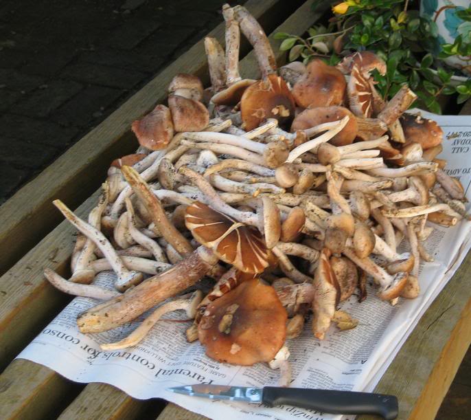 В это время проснулась Алёнка, и чтобы дать выспаться остальным, мы с ней отправились в лес по грибы. Вот, набрали ведро опят: