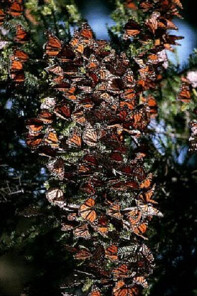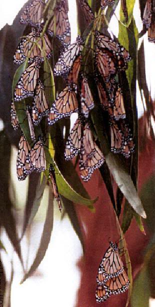 е завезенных из Австралии эвкалиптов (они впервые прибыли в Америку в 1850 году, и чрезвычайно размножились, вытесняя многие местные породы растений) оказалось положительным эффектом для мигрирующих бабочек: помимо убежища, эти деревья, цветущие в зимнее время, предоставляют пищу монархам – нектар их пушистых цветов оказался по вкусу бабочкам-дальнобойщицам.В заповеднике монархи висят, цепляясь один за другим, образуя гигантские гроздья, вернее сказать – гирлянды, свисающие с деревьев.