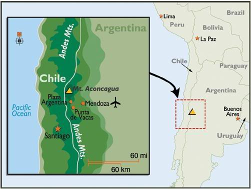 Всё ясно. Дима собрался на очередную гору. Оказалось, на этот раз - в Анды. 16 декабря я отвёз его в аэропорт. Дима вылетал по маршруту Сан-Франциско - Майами - Сантьяго. В аэропорту чилийской столицы ему предстояло встретиться с двумя спутниками. Андрей с женой Наташей летели в Сантьяго из дому, из Нью-Джерси, вместе им предстоял ещё 45-минутный полёт через горные хребты из Сантьяго в аргентинский городишко Мендосу, и уже оттуда - медленная дорога в горы.Высота Аконкагуа - 6959 метров над уровнем моря. Так с самолёта выглядит сама гора и подходы к ней:
