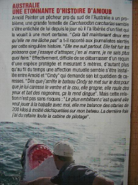 Действительно, нелегко избавиться от семнадцатифуто вой акулы, и не только потому, что great white sharks в Австралии защищены законом о защите определённых видов океанской фауны, но, главным образом, из-за взаимности, возникшей между Арнольдом и «Синди». Арнольд говорит: «Как только я застопорю двигатель, она плывёт ко мне, поворачивается на спину и позволяет ласкать её пузо и шею, при этом она похрюкивает, вращает глазами и бьёт плавниками по воде, чтобы выразить своё счастье»... "