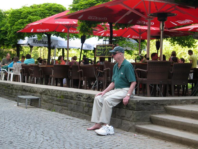 Я с радостью обнаружил, что некая экстравагантно сть кёльнской публики, покорившая меня в мой первый визит, не покинула город. Вот, гляньте хоть на этого почтенного гражданина, присевшего освежить ступни ног у входа в кафе на набережной