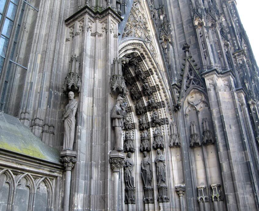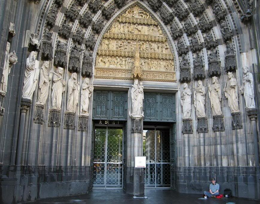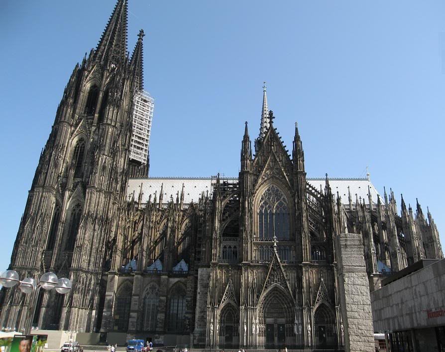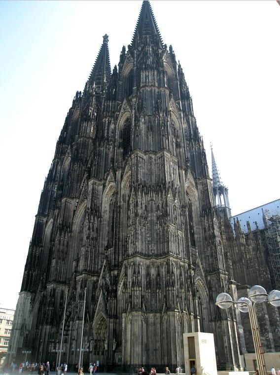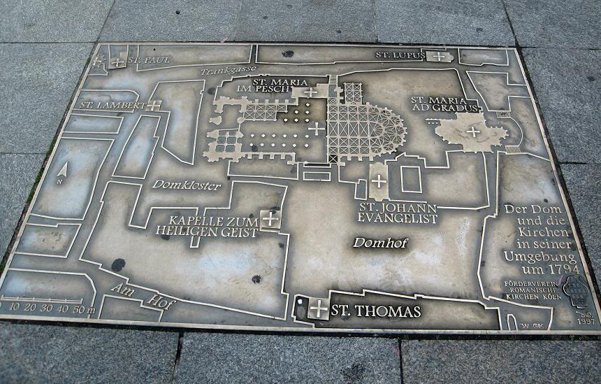 Кёльнский кафедральный собор Святого Петра был заложен в 1248 году. К созданию этого необыкновенног о здания приложили руку мастера, имена многих из которых затеряны в истории. Известны Жерар из Амьена (1257 год), его сына Арнольд (1308) и Иоганн (1322). Центральная часть собора («хор») была закончена в общих чертах к 1320 году. Дальнейшие работы двигались без особой спешки. На гравюрах шестнадцатого-семнадцатого веков собор изображён ещё без башен, да и по высоте существенно уступает соседней романской церкви двенадцатого века. Чтобы ясен был план собора и окружающей площади, я приведу фото бронзовой плиты, вделанной в тротуар к югу от собора: