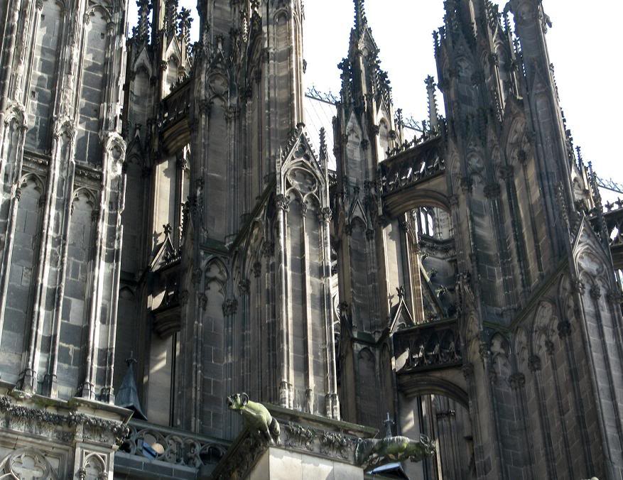 Совсем плохо приходится Собору в нашу эпоху: выхлопные газы автомобилей, загрязнение воздуха промышленными выбросами, кислотные дожди и дым разъедают старинную кладку. Слой наружной поверхности на глубину до 10 см пропитан копотью и быстро приходит в негодность (помните в ‘Скифах’ у Блока: «Кёльна дымные громады»?...) Евросоюз тратит десятки миллионов евро в год на борьбу с энтропией – на ремонт Собора, стараясь обогнать разрушающее влияние среды. Видите на снимках ажурные леса? – это идут работы по замене наиболее повреждённых участков «кожи» Собора более светлыми пластмассовыми вставками, стойкими к атмосферным воздействиям – вставки отчётливо видны, если присмотреться к фотографиям.