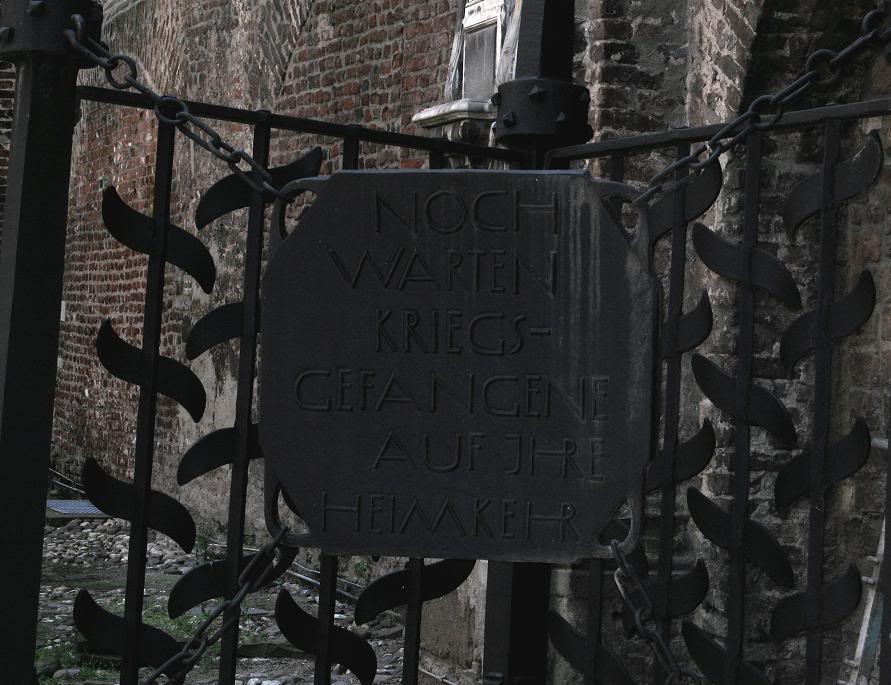 Я не большой знаток немецкого и перевёл её как «Они всё ещё ждут войны – пойманы, прийдя домой», но эта фраза не слишком богата смыслом. Было бы неплохо, если бы немецкие товарищи подсказали, как в самом деле правильно понимать эту надпись.